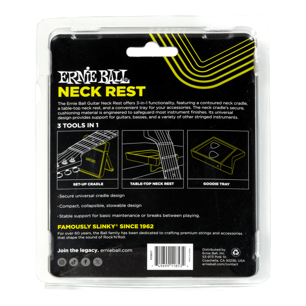 The Ernie Ball Guitar Neck Rest is a versatile, all-in-one solution that makes instrument maintenance and setup easier, safer, and more organized. Combining three essential functions into a single compact accessory, it features a contoured neck cradle that securely supports your instrument during string changes, adjustments, and cleaning. The stable table-top neck rest provides a reliable foundation on any flat surface, helping prevent unwanted movement while you work. The design includes a convenient accessory tray that holds picks, screws, tools, and small parts, keeping everything within reach. Constructed from a durable, non-marring cushioning material, the neck cradle is engineered to protect a wide range of instrument finishes while delivering a firm yet gentle hold. With its universal design, the Ernie Ball Guitar Neck Rest is compatible with most guitars, basses, and other stringed instruments, making it an indispensable addition to any player’s toolkit.