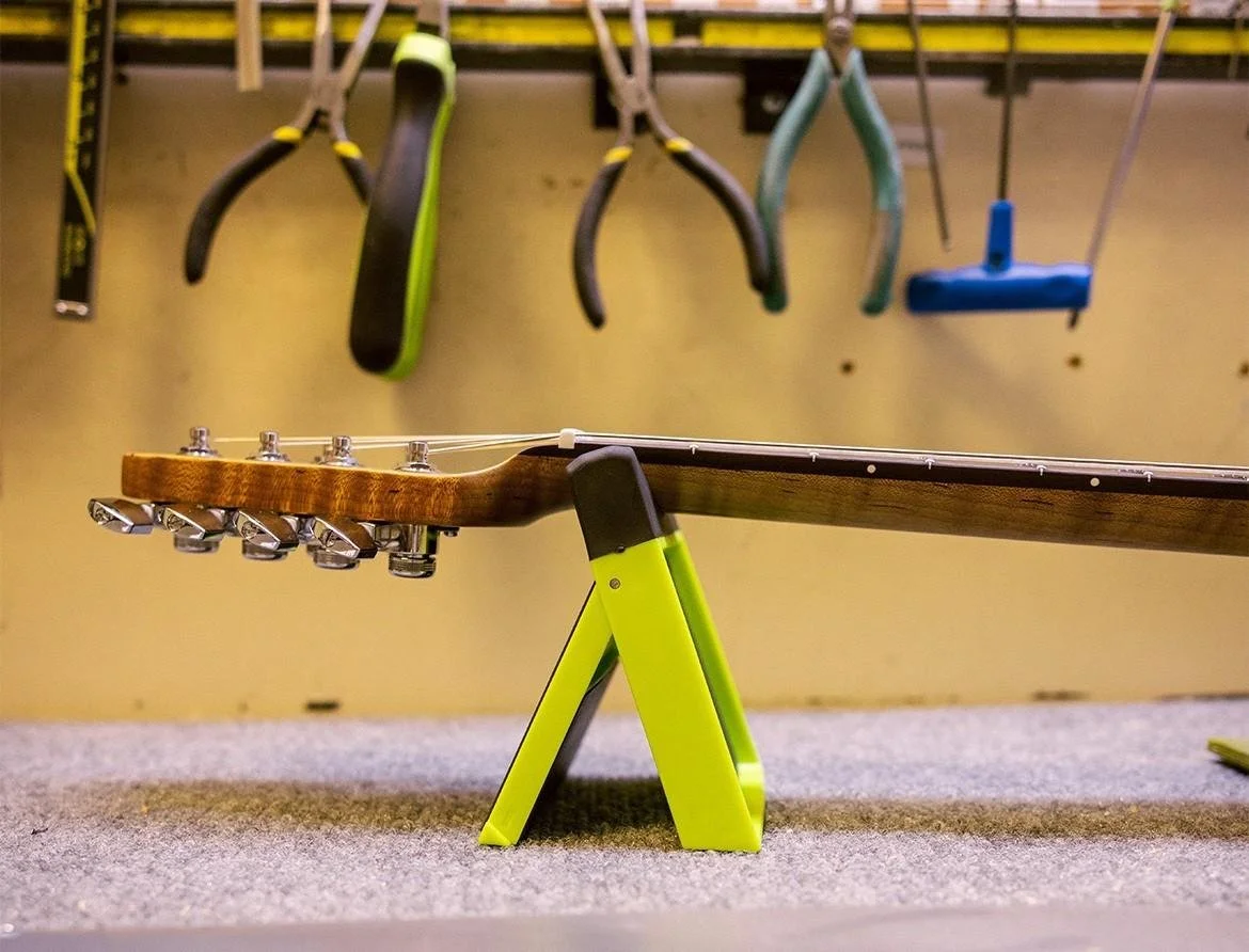 Ergonomically designed cradle holds guitars, basses, and other stringed instruments firmly in place during setups, string changes, and repairs.