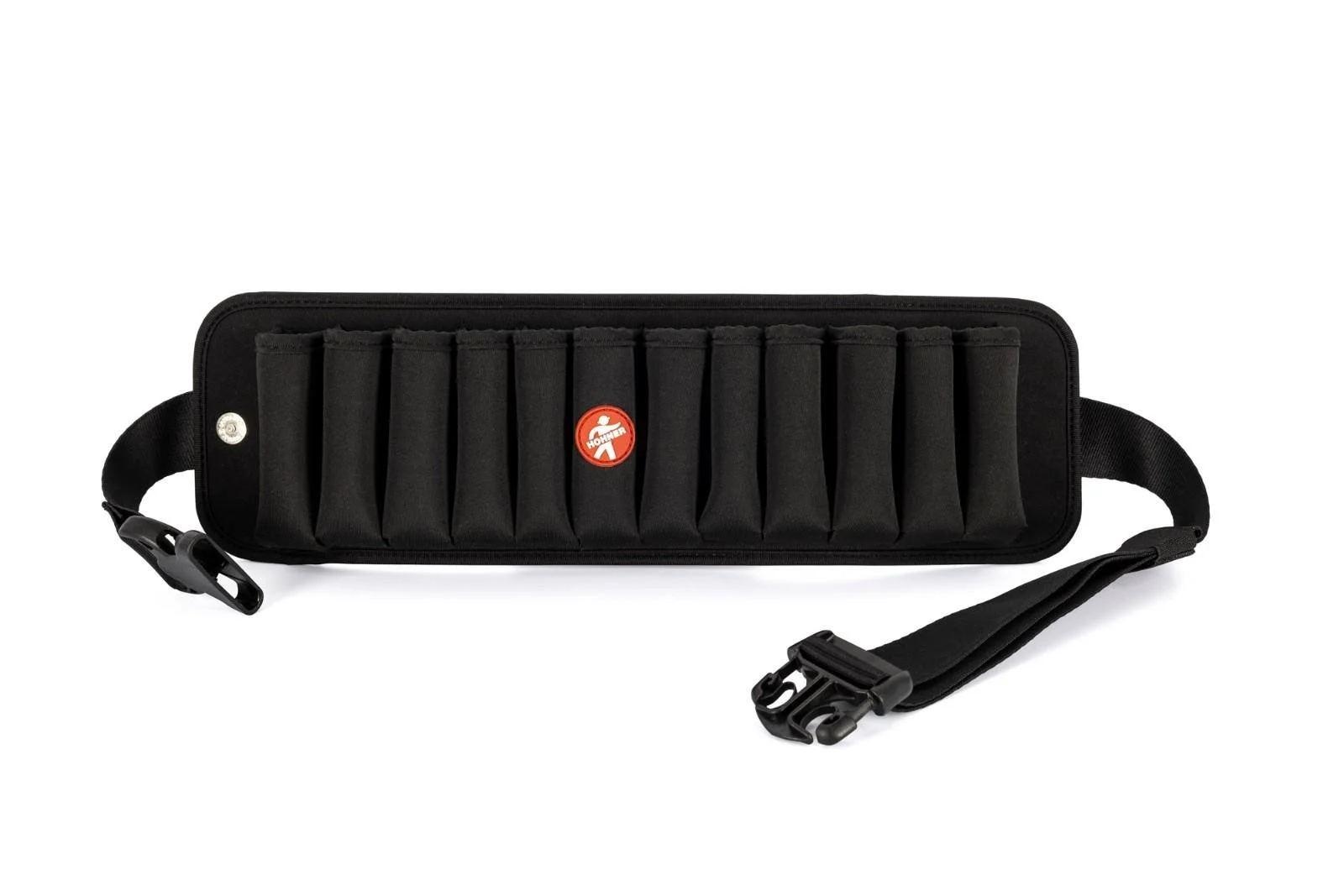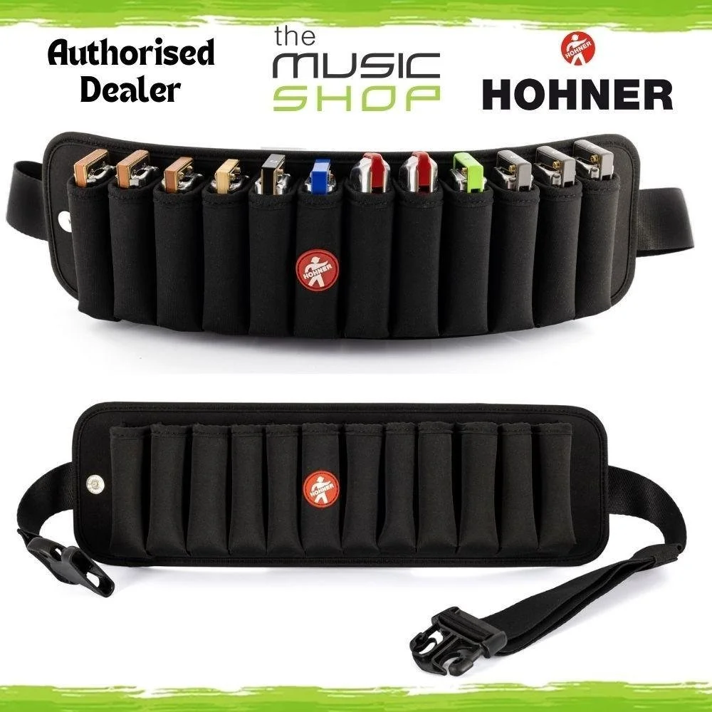 The FlexBelt offers space for up to 12 diatonic harmonicas, is practical and comfortable to wear and can be quickly and safely adjusted to different body dimensions.