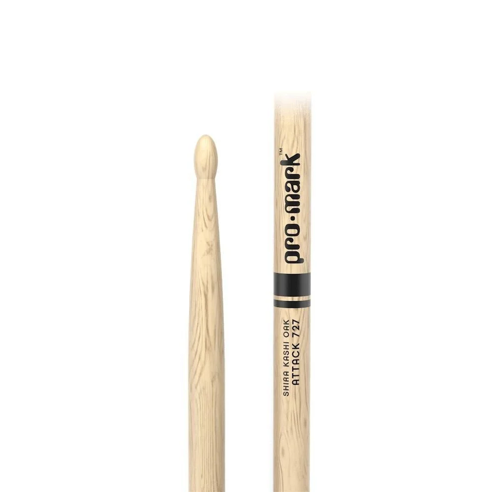 The ProMark Classic Attack 727 drumstick features an oval tip shape, short taper, and dense Shira Kashi Oak, producing a forward-weighted feel with increased power and durability.