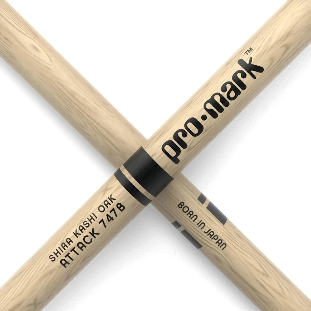 The ProMark Classic Attack 747B drumstick features an oval tip shape, short taper, and dense Shira Kashi Oak, producing a forward-weighted feel with increased power and durability.