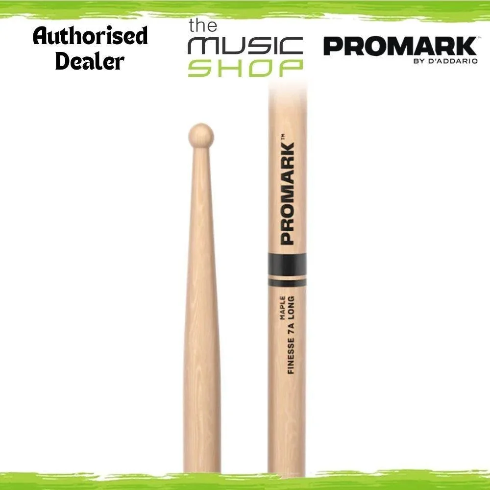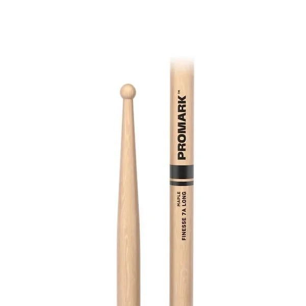 The ProMark Finesse 7A Long drumstick features an extra 1/2" of length for added reach, with the same diameter, taper, and small round tip as the standard Finesse 7A.