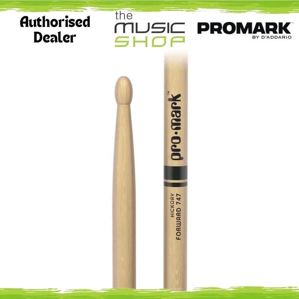 The ProMark Classic Forward 747 drumstick features an oval tip shape and a short taper, producing a forward-weighted feel for increased power.