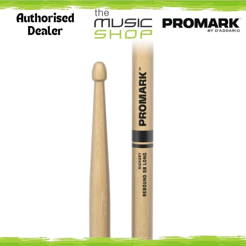 The ProMark Rebound 5B Long drumstick features an extra 1/2" of length for added reach, with the same diameter, taper, and acorn tip as the standard Rebound 5B.
